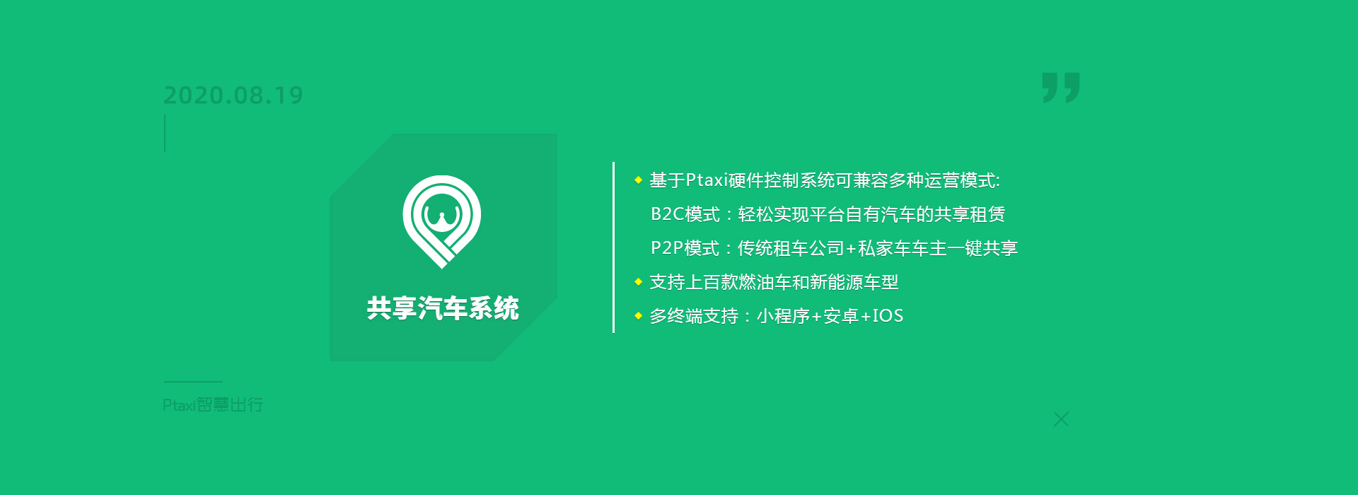 Ptaxi擁有快車、專車、順風車、租車、代駕、出租車、跑腿、共享汽車等多項功能,可根據需求自由組合,快速定制屬于自己的網約車系統支持多終端